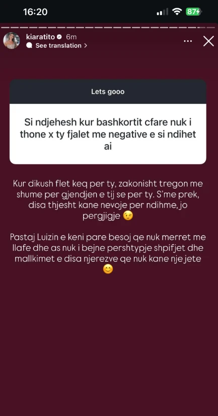 “Pastaj Luizin e keni parë besoj që nuk merret me llafe dhe as nuk i bëjnë përshtypje shpifjet dhe mallkimet e disa njerëzve që nuk kanë një jetë”