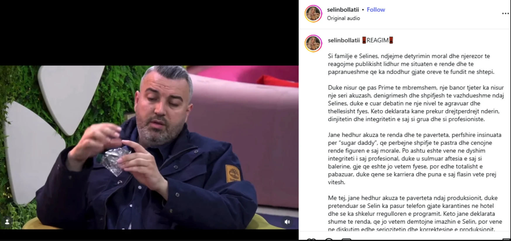 Lidhur me akuzat e rënda që ka bërë Rogerti ndaj Selin, ka reaguar familja e balerinës. Sipas tyre, këto deklarata të banorit kanë prekur drejtpërdrejt nderin, dinjitetin dhe integritetin e saj si grua dhe profesioniste.