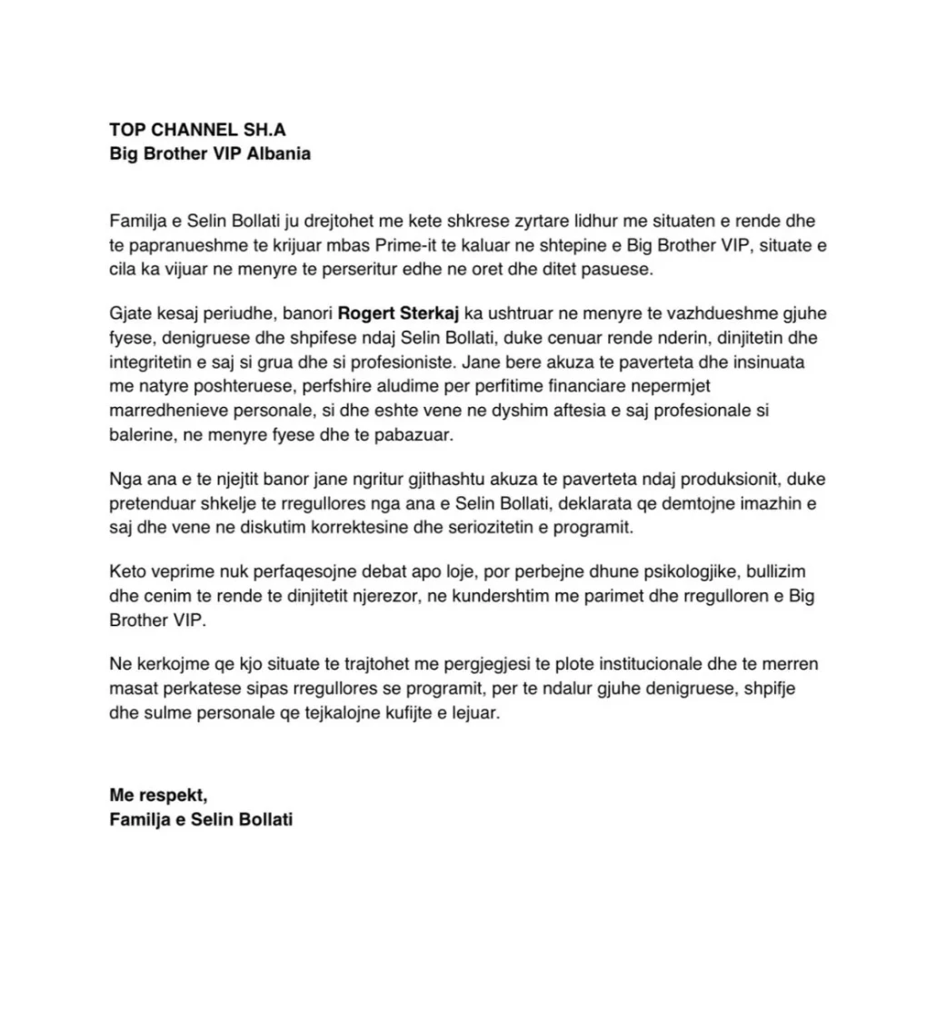 Familja e Selin Bollatit i është drejtuar zyrtarisht Top Channel dhe produksionit të Big Brother VIP Albania, duke shprehur shqetësimin e tyre të thellë për situatën e krijuar pas Prime-it të fundit në shtëpinë e BBVIP.