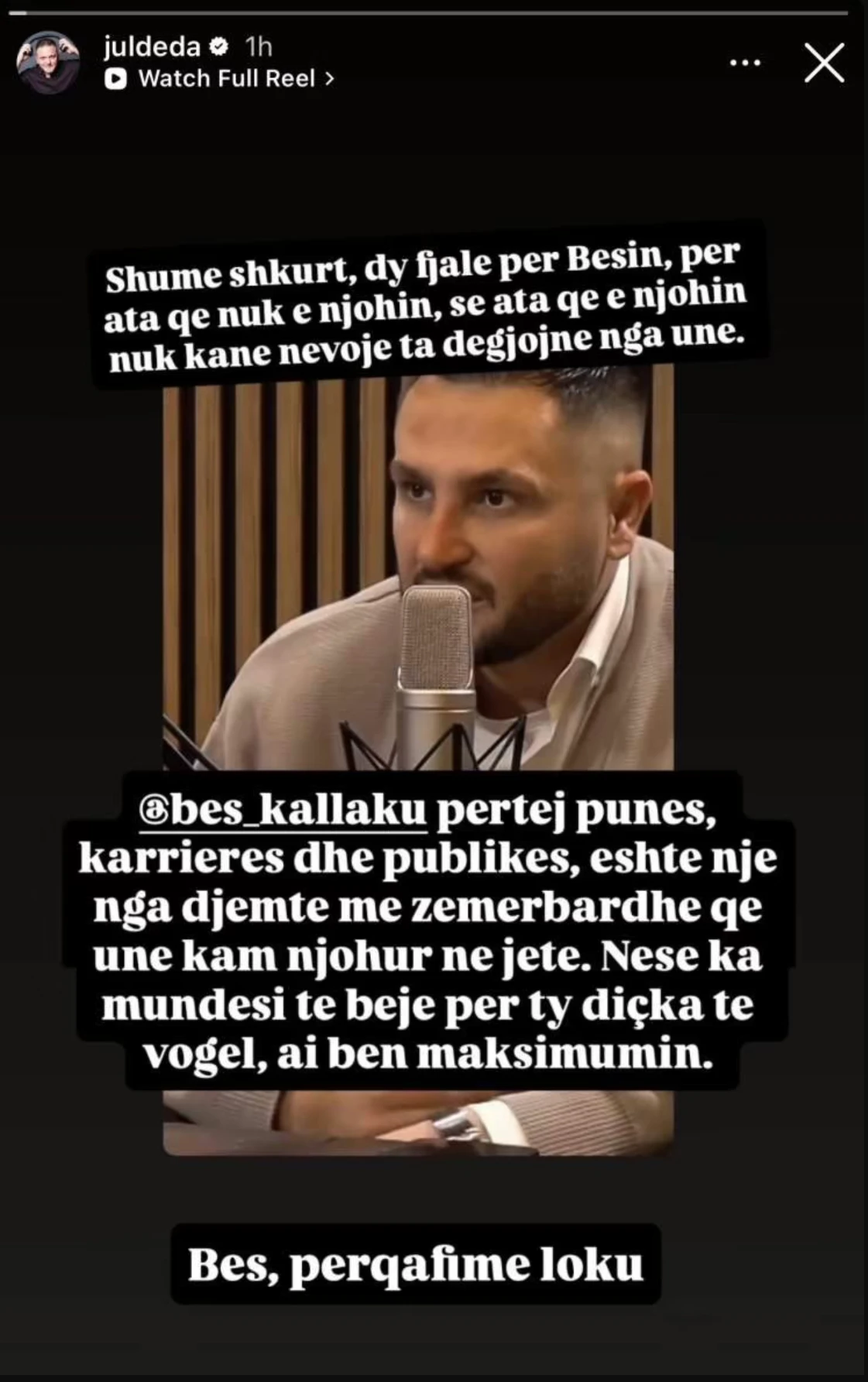 Në një postim të shkurtër te ndare ne story në Instagram, Deda thekson se fjalët e tij janë për ata që nuk e njohin vërtet Besin, pasi, sipas tij, ata që e kanë njohur nga afër nuk kanë nevojë për shpjegime.