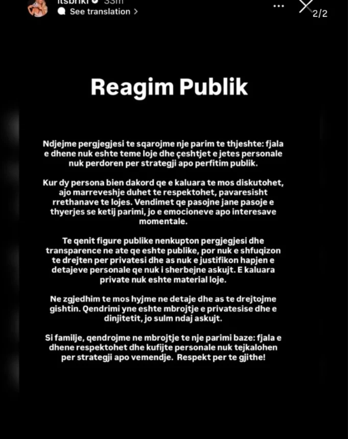 “E kaluara private nuk është material loje… Si familje, qëndrojmë në mbrojtje të një parimi bazë: fjala e dhënë respektohet dhe kufijtë personalë nuk tejkalohen për strategji apo vëmendje,” përfundon deklarata e tyre, duke kërkuar respektimin e dinjitetit të vajzës së tyre.