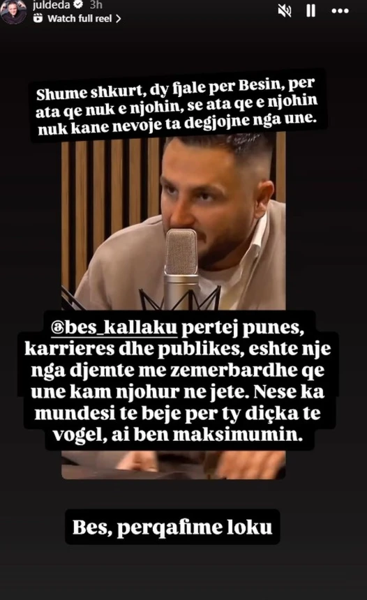 Nëse ka mundësi të bëjë për ty diçka të vogël, ai bën maksimumin,” shkruan Jul Deda krahas videos se podcastit të Grida Dumës, ku i ftuar ishte Besi.