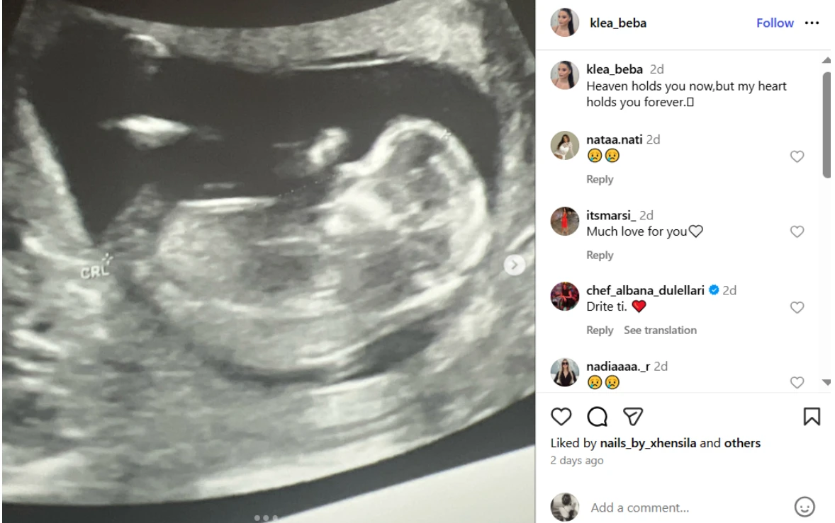 Përmes rrjeteve sociale, Klea ka njoftuar se ka humbur fëmijën.