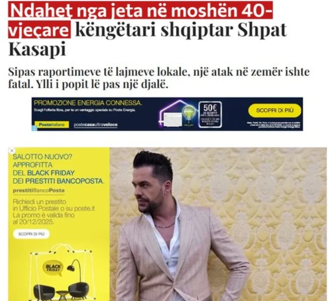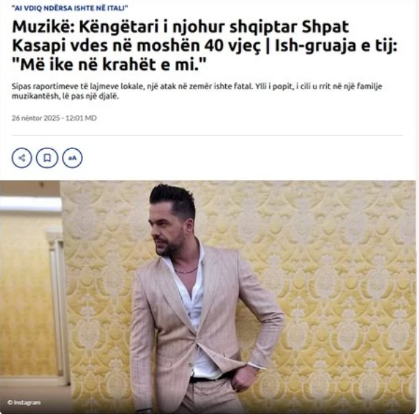 Tgcom24: Muzikë: Këngëtari i njohur shqiptar Shpat Kasapi vdes në moshën 40 vjeç | Ish-gruaja e tij: “Më ike në krahët e mi.”